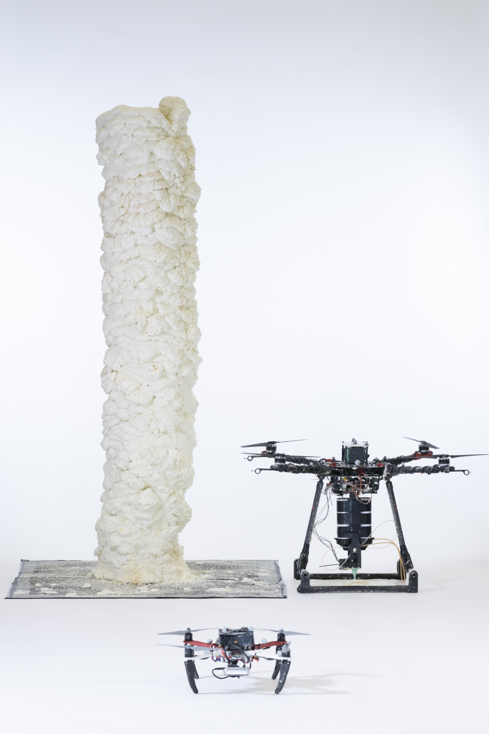 (Teamarbeit im 3D-Druck: Eine «BuilDrones» und eine «ScanDrone» haben diesen rund zwei Meter hohen «Turm» aus schnell härtendem Schaumstoff errichtet – Schicht für Schicht. Bild: University College London)