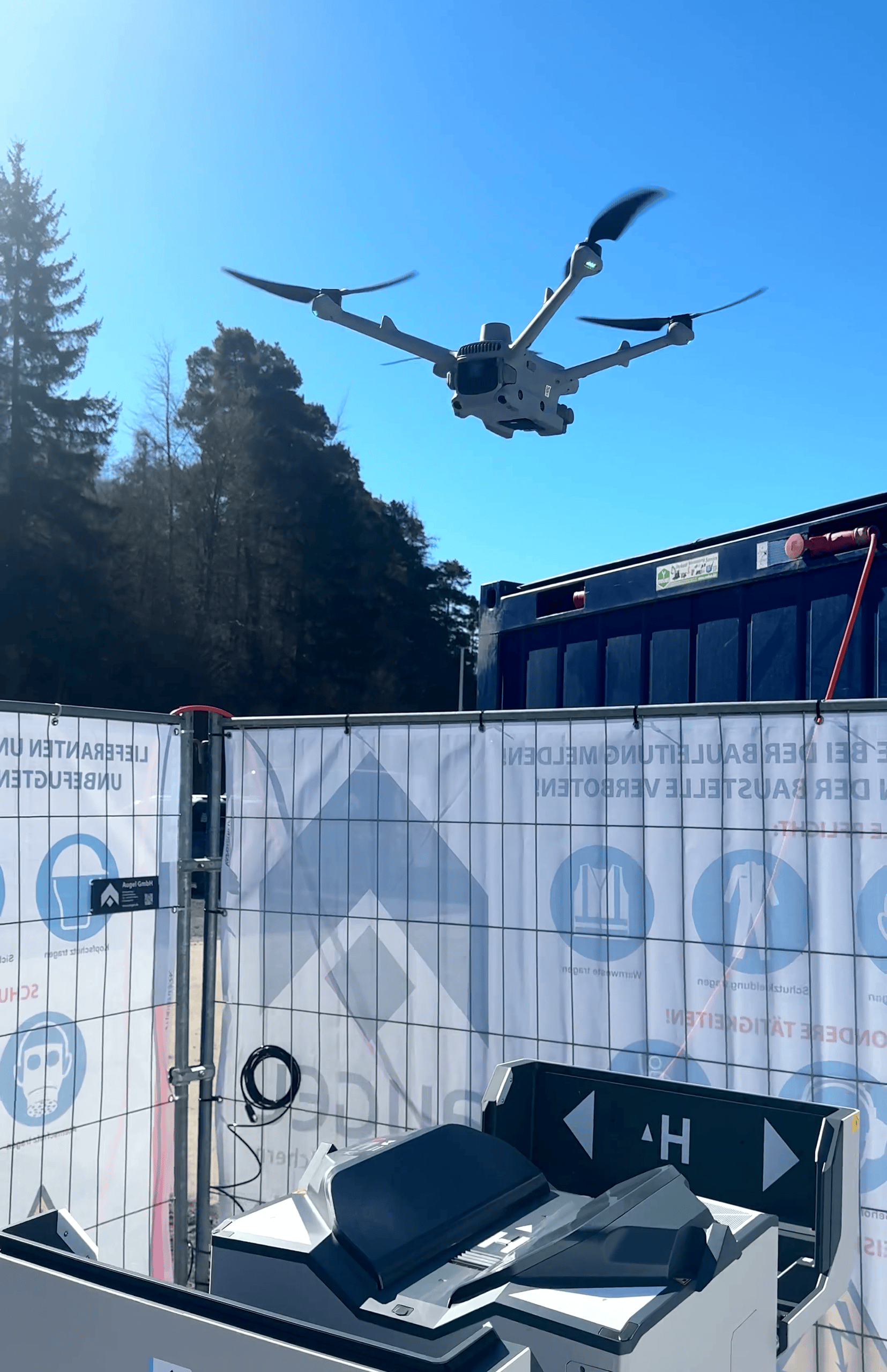 Autonomer Drohneneinsatz mit DJI Dock 2: Die DJI Mavic 3 Enterprise startet regelmäßig zu programmierten Kontrollflügen direkt vom Betriebshof aus, ganz ohne Personal vor Ort.
