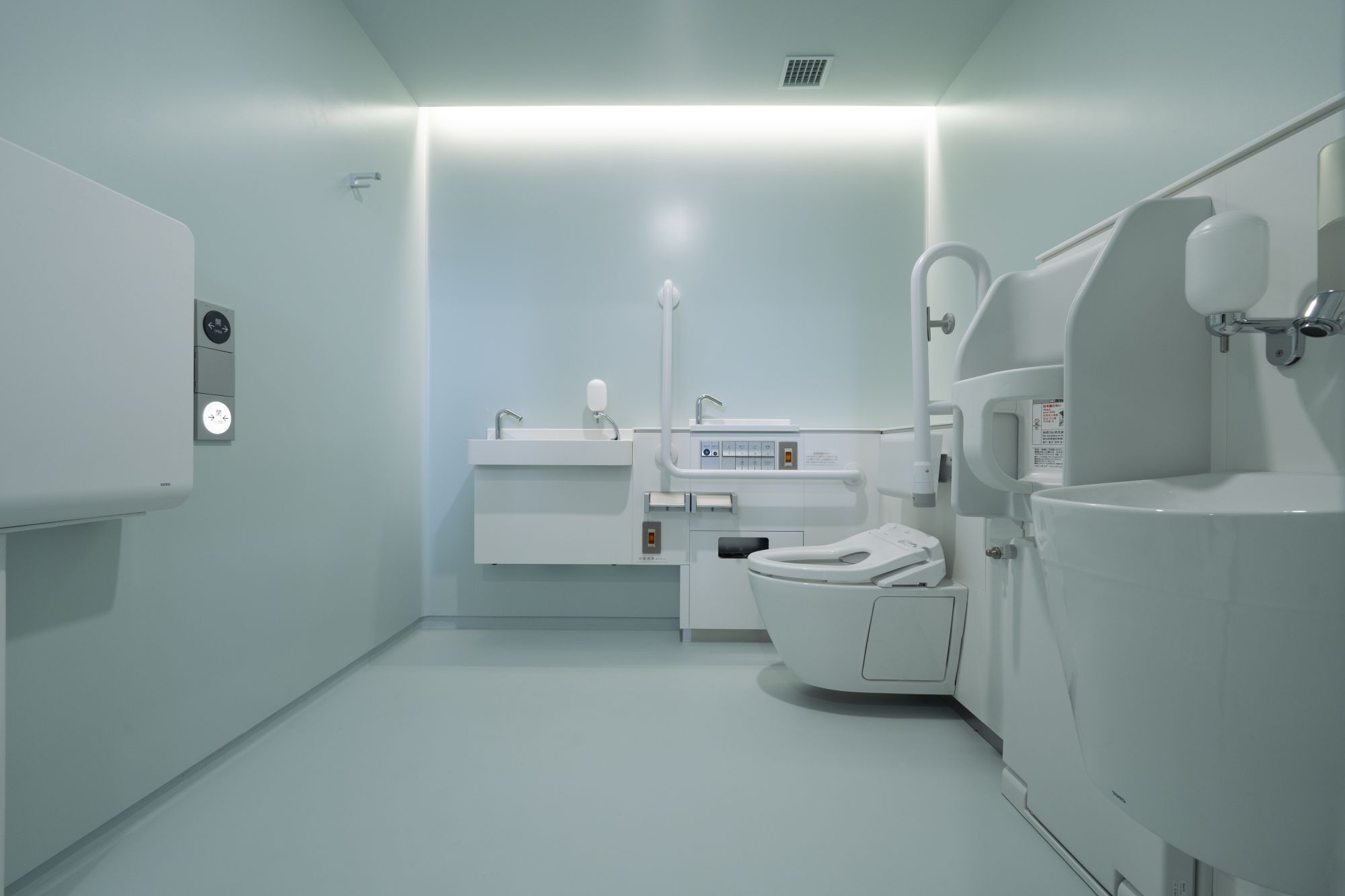 Die barrierefreien Kabinen werden über automatische Schiebetüren betreten. Alle Toiletten der Sanitäranlage sind mit Washlets von TOTO ausgestattet. Zudem gibt es kompakte, von TOTO entwickelte barrierefreie Toilettenpakete, die allen Menschen mit Rollstuhl oder mit einem Stoma den Zugang erleichtern. (Standort: Urasando/Designer: Marc Newson).